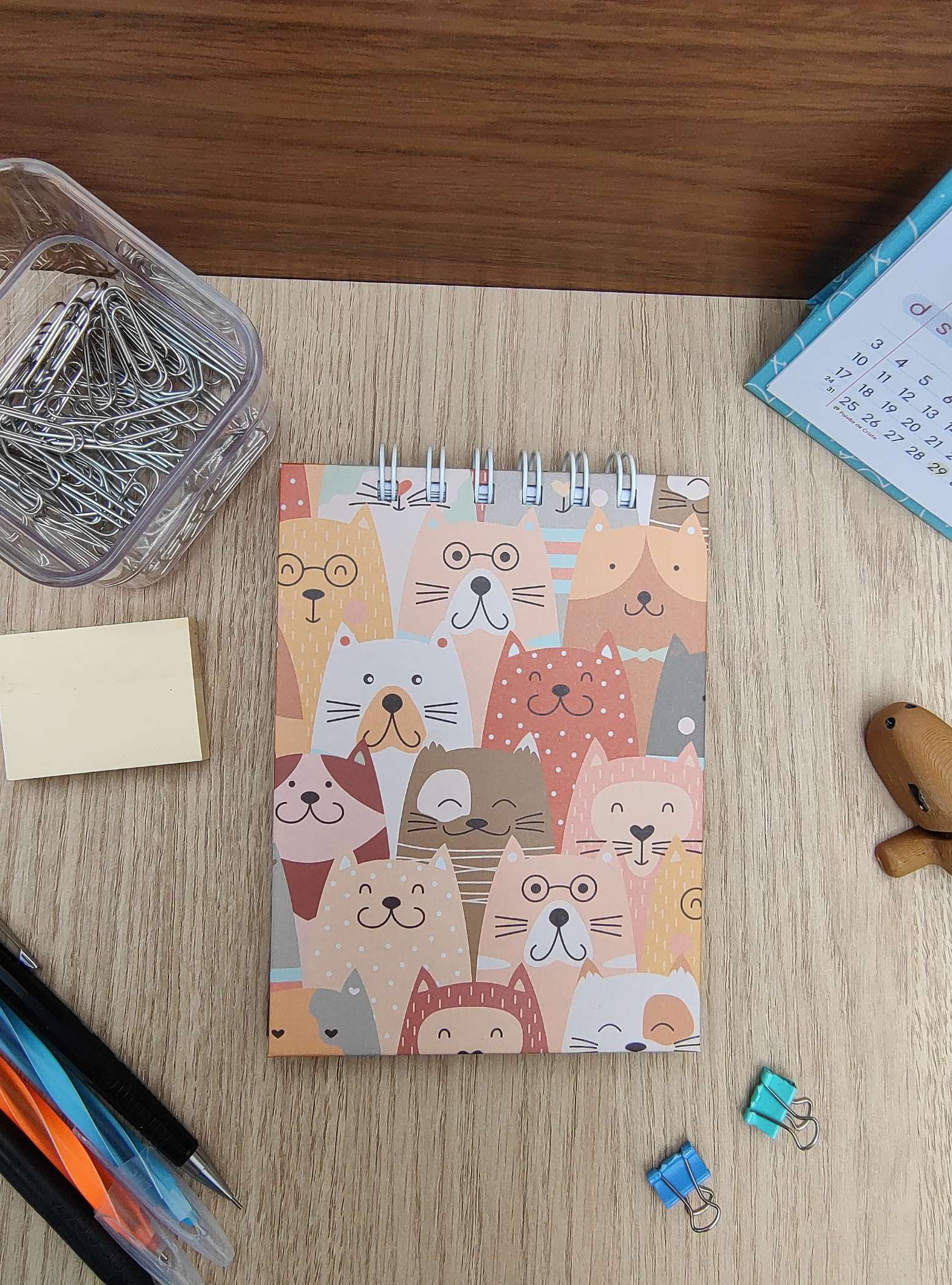 1. Estampa MiauMigos: Deixe-se abraçar pelo carinho do ronronar de gatinhos enquanto escreve suas ideias. A estampa MiauMigos decora a capa desta caderneta, adicionando um toque de diversão a cada palavra escrita.